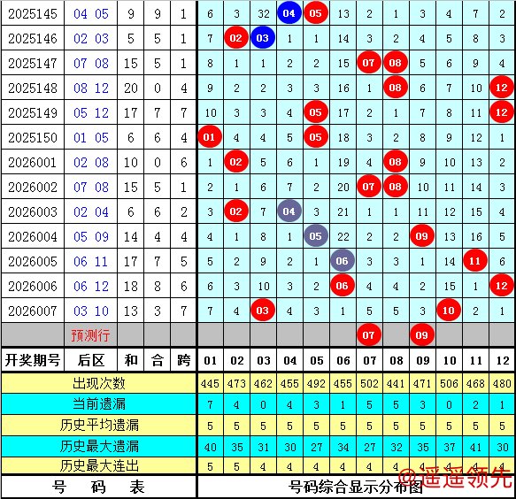 石浩第2026008期大乐透后区分析:后区上周星期一后区奖号为06和11,上期开出奖号03和10,最近9周星期一与最近9期后区奖号奇偶比分别为9:9和8:10,大小比分别为12:6和8:10,本期预计后区开出全奇组合,参考号码05、07、09、11。