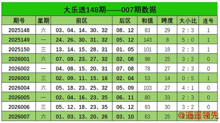 大乐透第2026007期出奖号统计:前区01、03、13、20、26,后区03、10。和值63,跨度25,大小比2:3BETWAY,未开出连号。