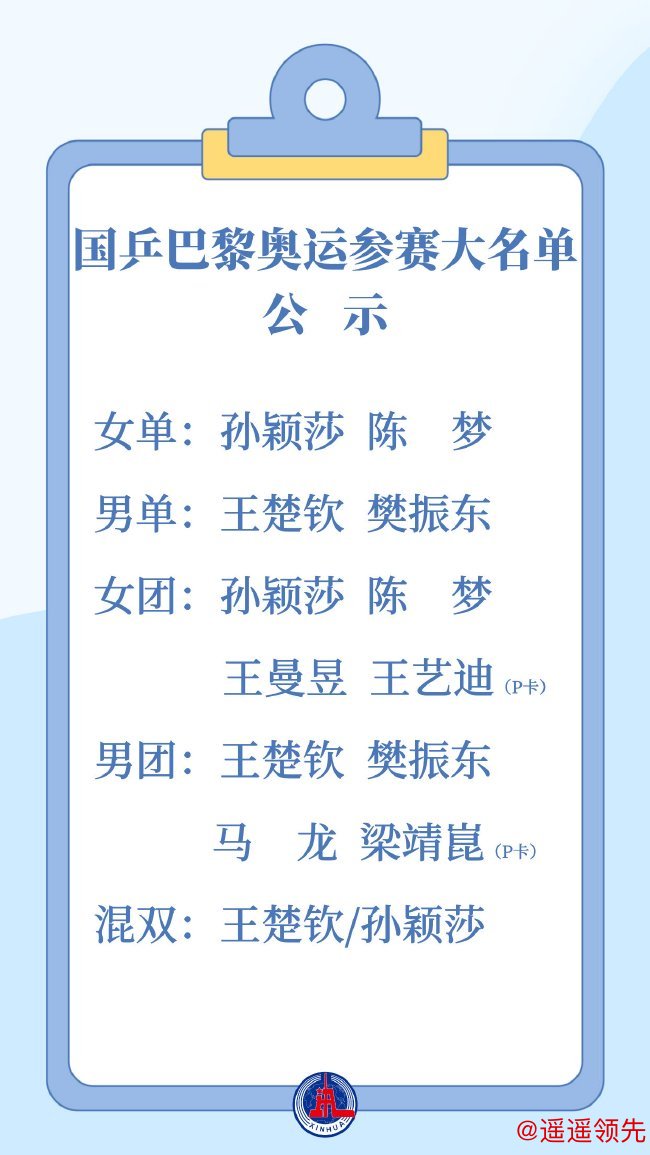 女单参赛运动员为孙颖莎、陈梦。女子团体参赛运动员为孙颖莎、陈梦、王曼昱、王艺迪(P卡:替补队员)。男子团体参赛运动员为王楚钦、樊振东、马龙、梁靖崑(P卡)。 按照中国乒协《乒乓球项目2024年巴黎奥运会参赛选拔办法(修订版)》相关规定,中国乒协对上述名单进行公示。 此前,必威体育下载中国乒协已对巴黎奥运会混双、男单参赛运动员名单进行过公示。混双参赛运动员为王楚钦/孙颖莎必威体育下载,男单参赛运动员为王楚钦、樊振东。(完) |