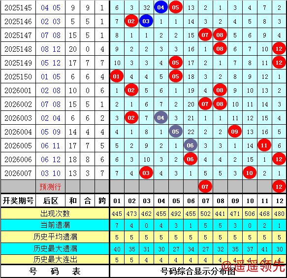 和尾大小:最近10期和尾大小比为2:8,小 号和尾表现相对较热,小 号和尾连续开出了5期,短期内不会转冷,本期继续关注小 号和尾。 和尾质合:最近10期和尾质合比为7:3,合数和尾表现相对较冷,当期遗漏2期,本期适当关注合数和尾回补。 和值跨度:上期和值开出63,对比第2026006期和值下降了30个点位,本期预计和值在大号区域热出,看好出现在90周围。